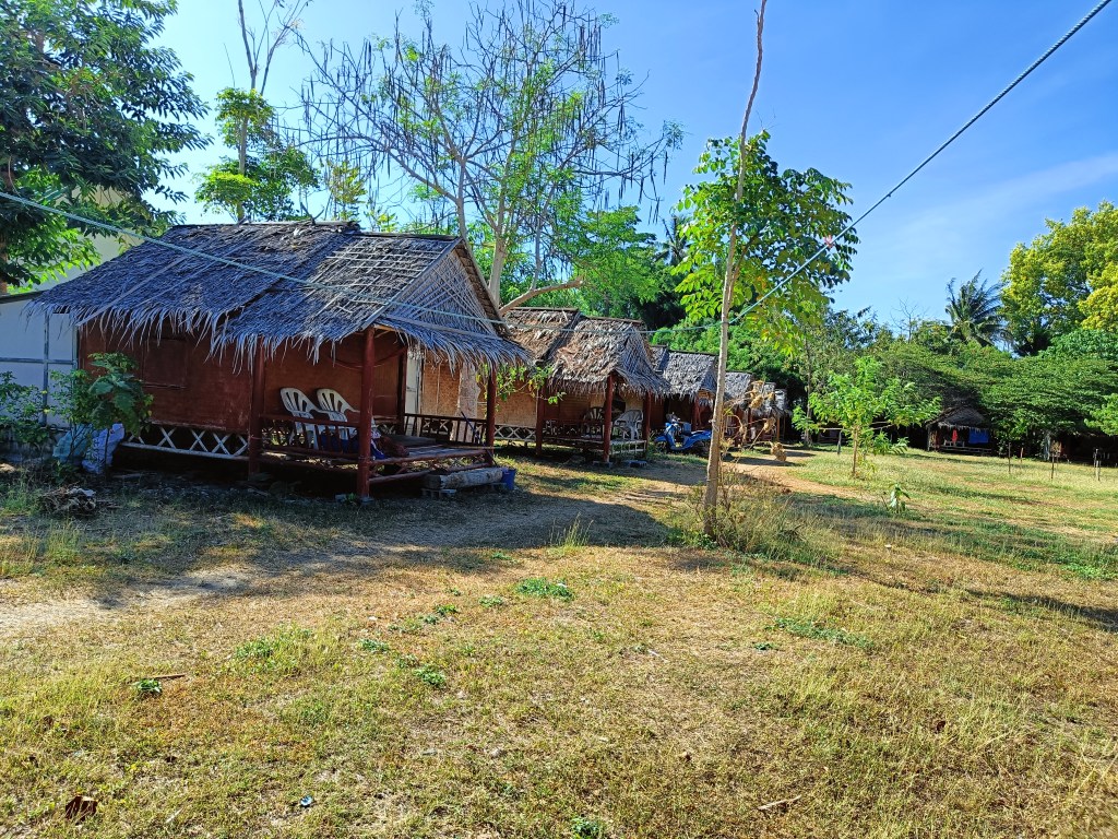 Notre aventure dans le sud de la Thaïlande commence enfin ! Nous découvrons notre logement pour les 3 nuits à venir sur l’île de Koh Lanta. Et il est pour le moins atypique ! Nous avons choisi une hutte en bambou, tout ce qu’il y a de plus minimaliste : 4 murs, une terrasse avec un hamac, un matelas au sol avec sa moustiquaire, 1 wc, et 1 tuyau en guise de douche (pas d’eau chaude donc). Ni plus, ni moins. Et pour 5 personnes ! Les gérants du lieu étaient très dubitatifs quand on leur a affirmé que oui, nous allions dormir à 5 là-dedans. Et on a adoré notre petite cabane ! La seule chose qui nous a vraiment manqué, c’était un frigo. Car on ne pouvait pas mettre de l’eau au frais, donc pour éviter de boire de l’eau chaude toute la journée, on a dû acheter, je ne préfère pas compter combien, de bouteilles en plastique déjà réfrigérées. Le soir, il faisait frais car nous étions vraiment proches de la mer, donc la clim n’était pas du tout indispensable. Toutefois, on se serait peut-être passés des petits visiteurs à 6 pattes (1 gros cafard et des centaines de petites fourmis). Mais rien de bien méchant, pas de quoi nous gâcher notre séjour.