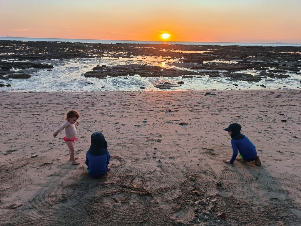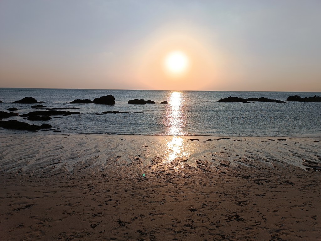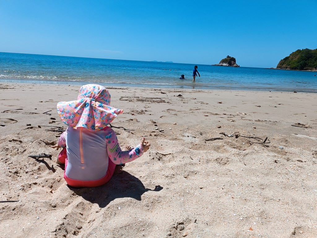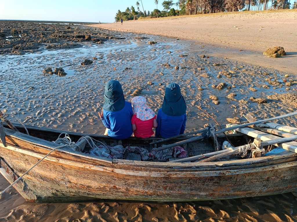 Après un peu de calme et de travail scolaire, on finit notre journée marathon des plages, par une plage plus au sud de l’île, dans un petit quartier animé un peu à l’abri de la route principale. On a été agréablement surpris ! De plus, sur cette plage, il était possible de se baigner à marée basse. La petite tribu était ravie ! On reste jusqu’au coucher de soleil et on profite de la quiétude des lieux jusqu’à la tombée de la nuit.