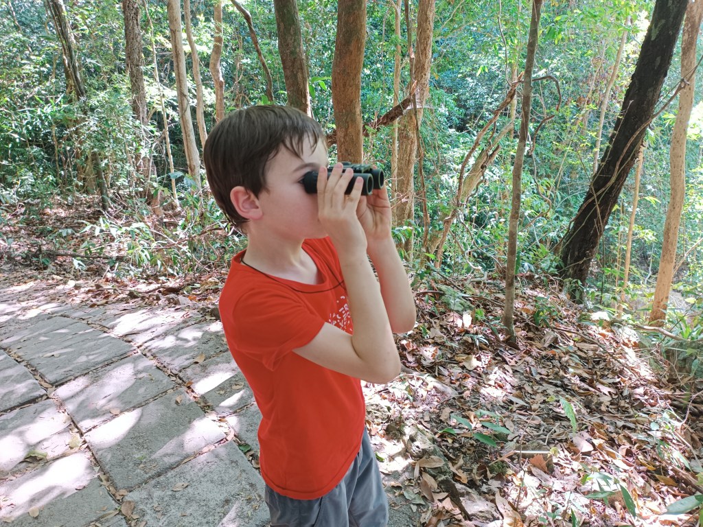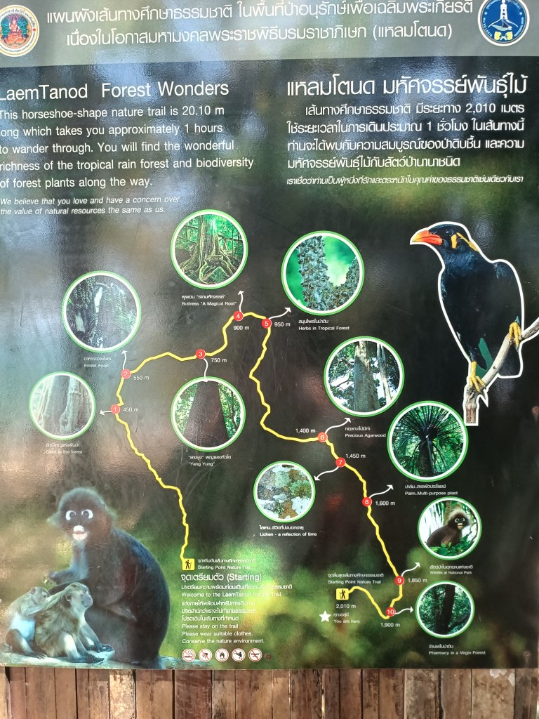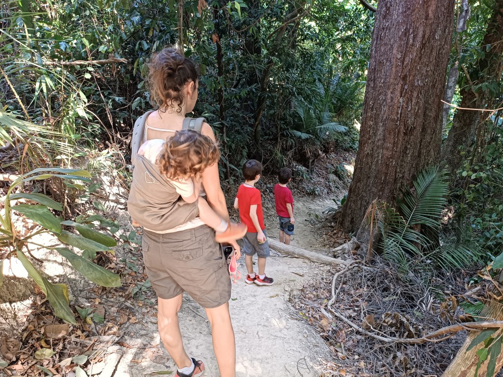 On part donc à bord de sa camionnette-taxi, direction l’extrême sud de l’île : le parc national de Mu Ko Lanta. Nous avons repéré une petite randonnée : dans les 2 km en pleine jungle, tarifs très abordables (200 baths par adulte), tout à l’ombre, qui monte un peu mais largement faisable avec les enfants. La description disait qu’on pouvait aussi croiser des singes.