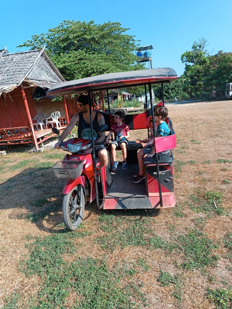 Les tarifs des chauffeurs privés nous ont fait repenser nos plans du lendemain. On ne souhaitait pas rester autour de l’endroit où on logeait car il n’y avait pas grand-chose à faire, à part la plage. Prendre un chauffeur un deuxième jour n’était pas envisageable non plus. Il restait l’option d’être autonome dans nos déplacements. Et ce qui se loue sur l’île, c’est le scooter. Impossible pour moi de conduire un scooter, encore moins avec mes enfants dessus. J’ai accepté un peu à contre cœur le scooter style tuk-tuk. Il ne va pas vite, c’est plus stable. Mais à refaire, je ne le referai pas. Même s’il ne s’est rien passé de vraiment dangereux, j’ai eu la boule au ventre tout le long (c’est un euphémisme) et j’ai mis plusieurs jours à me remettre de mes émotions.