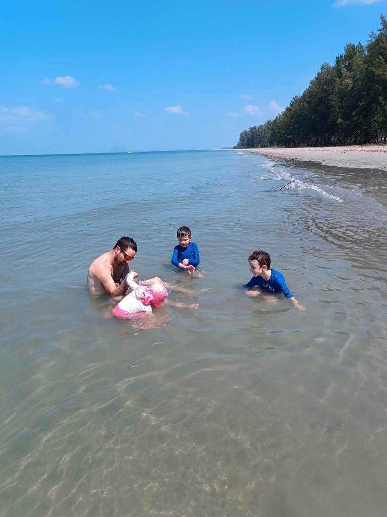 On rejoint Arun, notre chauffeur pour rejoindre Lanta Old Town. Il est déjà midi et les petits randonneurs ont très faim. Il s’arrête en chemin à Bamboo beach, pour nous montrer une belle plage. Qui était très belle en effet, mais les estomacs sur pattes que sont nos enfants ne sont pas très réceptifs à la beauté du paysage avec le ventre vide. On fait quelques photos mais on ne s’attarde pas.