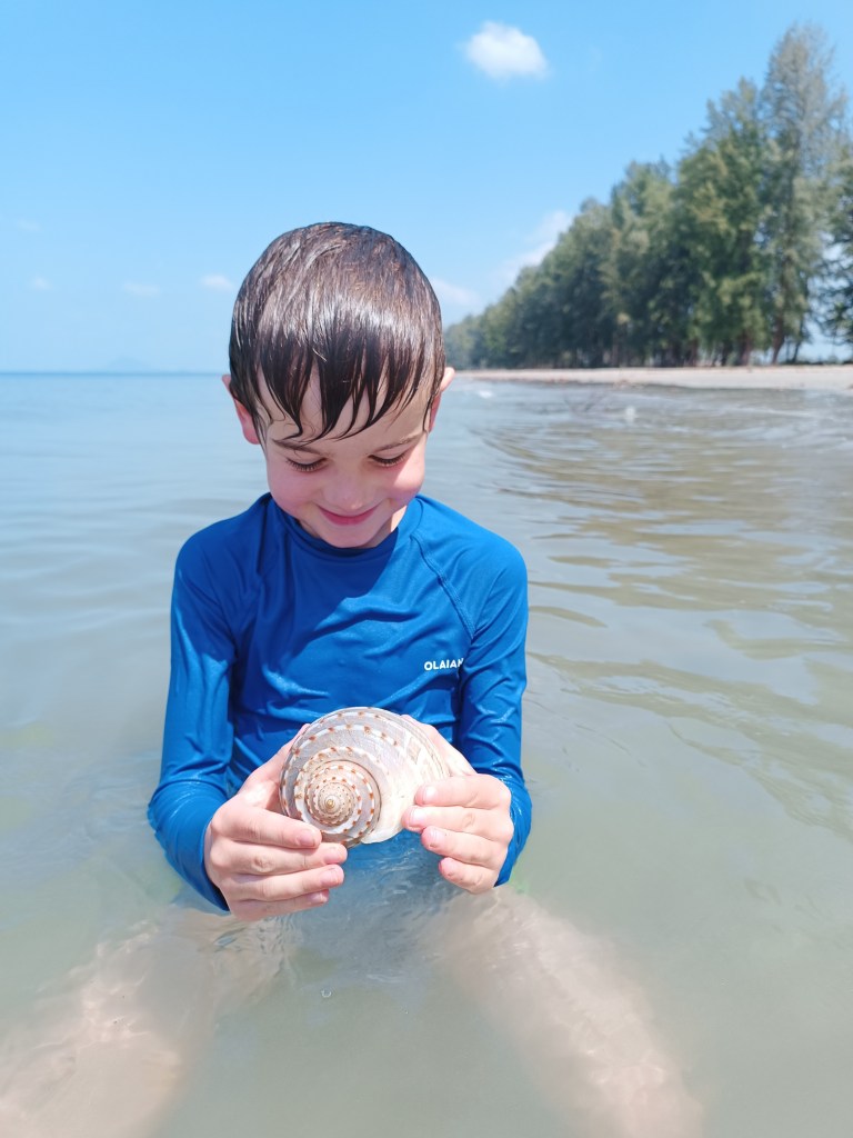 Un fois le scooter en main, cap sur le nord de l’île, le sud étant trop vallonné pour circuler avec ce type de véhicule. Au nord, Koh Lanta Noi (Noi qui veut dire petit), ce sont les villages de pêcheurs, les gitans des mers, la nature luxuriante, les plages désertes, aucun touriste… On s’arrête à une plage immense, pas forcément la plus belle, mais au moins l’une des plus agréables qu’on ait faites. Le sable était aussi fin que de la farine. Je n’avais vraiment jamais vu, ni touché un sable de cette qualité. En matinée, elle est ombragée. On est absolument seuls sur des kilomètres de plage. On a pu découvrir notre premier gros coquillage, que nous avons relâché ensuite car il avait toujours son habitant à l’intérieur.