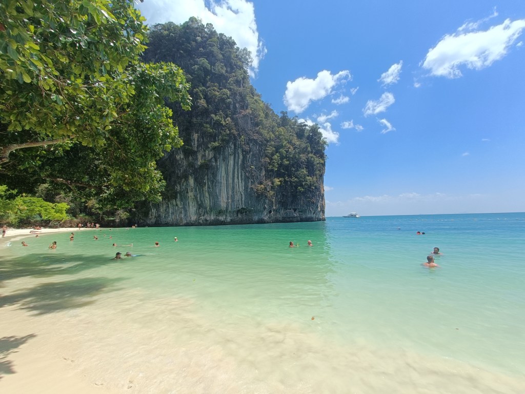 On redémarre, direction une petite île, pas loin de Hong Island. Cette fois ci, on accoste et on descend du bateau. On a 1h d’arrêt, pour profiter d’une petite baignade. Le décor est magnifique, la mer est belle et bien chaude (mais pas de snorkeling, car l’eau trouble et les méduses sont de la partie), on est à l’ombre. Il y a du monde, mais on s’enferme dans notre bulle à 5 et on profite de ce moment hors du temps. Après notre baignade, on rejoint le groupe, il faut quitter les lieux pour laisser la place aux autres bateaux qui arrivent. Chacun son créneau, tout est bien ficelé.