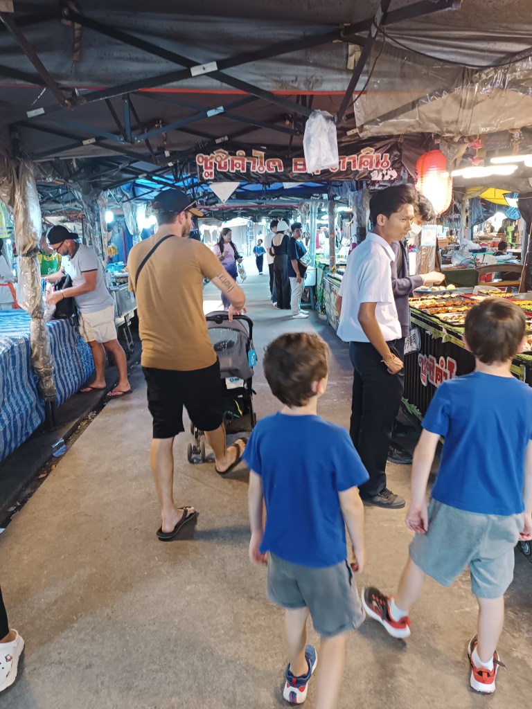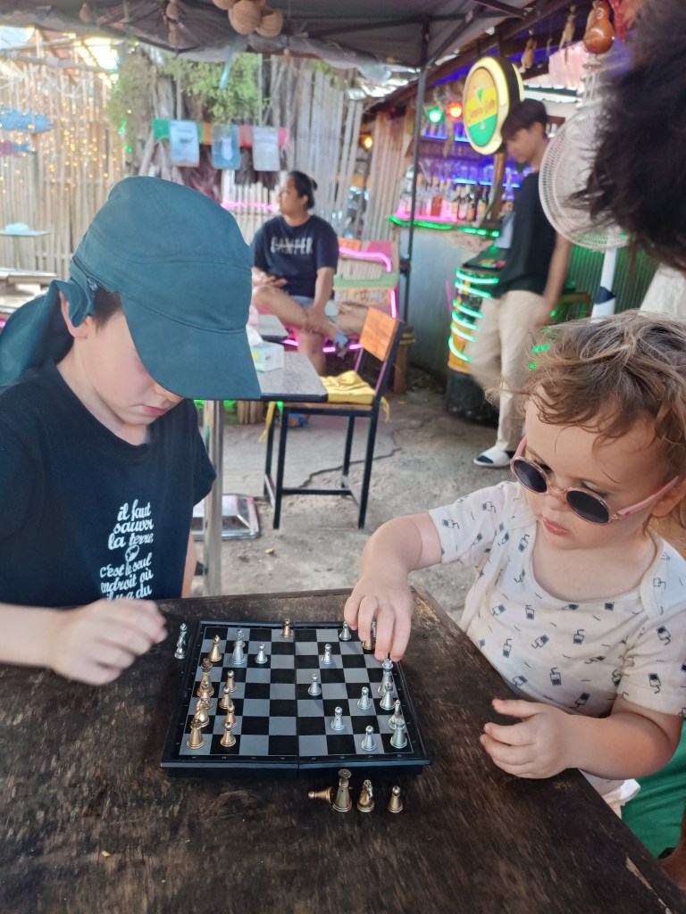 En arrivant dans le centre de Krabi, nous avions prévu le coup et on fait tourner une machine à la laverie. Pendant ce temps, on passe un moment très agréables dans un bar à jeux, une boisson fraîche pour les parents et une glace pour les enfants, des jeux de cartes, un jeu d’échec, un puissance 4… On terminera cette journée bien remplie avec un repas du marché, le même marché que la veille, car nous l’avions vraiment adoré.