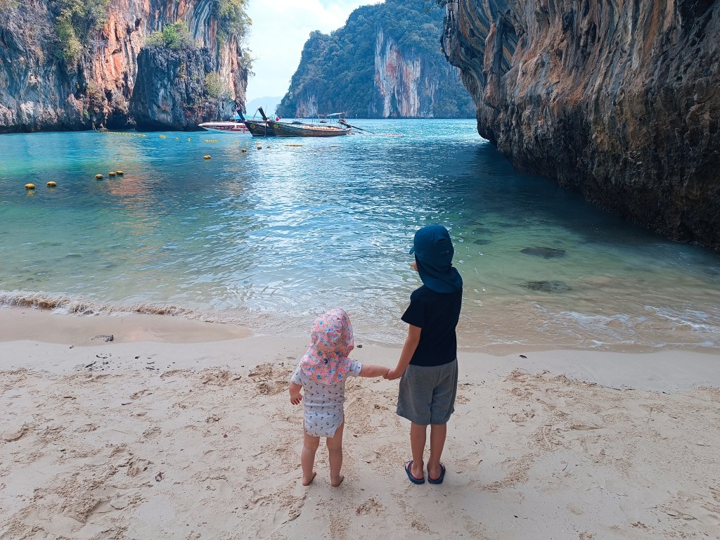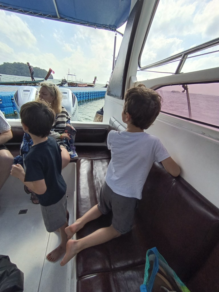 RDV 8h devant l’agence, un mini-van passe nous récupérer et nous amène sur la magnifique plage d’Ao Nang. Même si au fond de nous, nous savions, on a été assez choqués du monde sur les lieux. Et pour cause, cette plage digne d’une carte postale est le point de départ de quasiment toutes les excursions, de toutes les agences. Les minibus arrivaient par dizaines, les stands de tours opérateurs pullulent à chaque recoin de la plage. On cherche le nôtre, on pénètre dans la foule et on entend parler toutes les langues sauf le thaï. Environ 30 minutes plus tard, notre guide de la journée nous fait signe et on rejoint notre bateau. Ouf, nous ne sommes « plus que 24 ». Le bateau démarre, les garçons ont tous les sens en éveil, et ils sont trop contents de vivre cette expérience. Rien que pour leurs petites têtes avec les cheveux au vent et le sourire jusqu’aux oreilles, cette journée valait le coup.