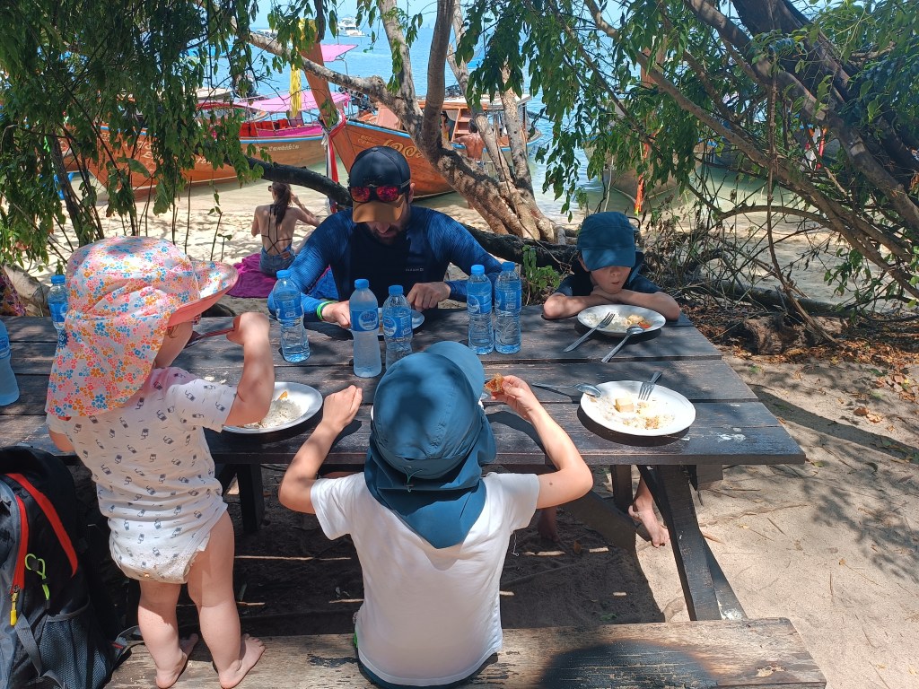 Cette fois-ci, c’est la pause déjeuner. On descend sur une toute petite île, nous n’étions pas les seuls bien sûr. On nous propose un petit buffet chaud de spécialités thaï et toute la famille a validé, et s’est resservi 2 fois (sauf pour le tofu que j’ai dû finir dans chaque assiette !), et des fruits frais déjà coupés en dessert. On fait le tour de cette mini île, quelques photos, quelques jeux dans le sable pour digérer et c’est l’heure de repartir.