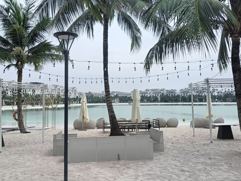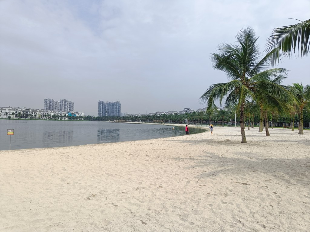 Nous avons notre rythme de croisière, en journée on profite des alentours du quartier, on se balade dans Vinhome Ocean Park, on longe à pied les bords de la plage aménagée, le coin est joli, bien aménagé pour se détendre, se promener ou pour jouer, bien qu’il soit complètement artificiel.