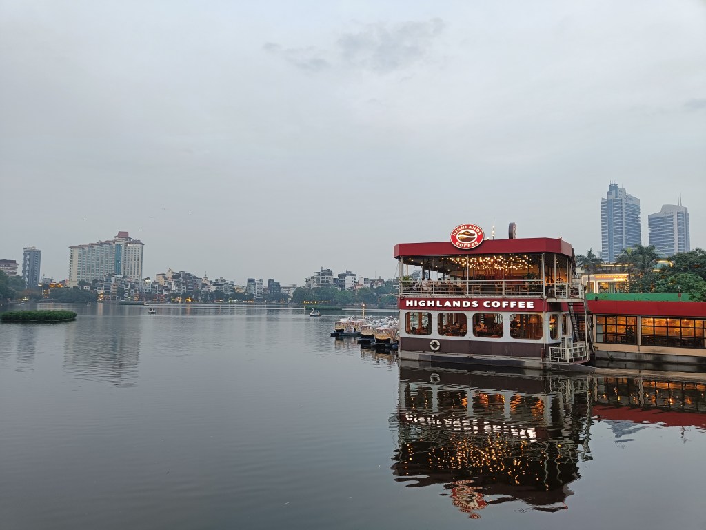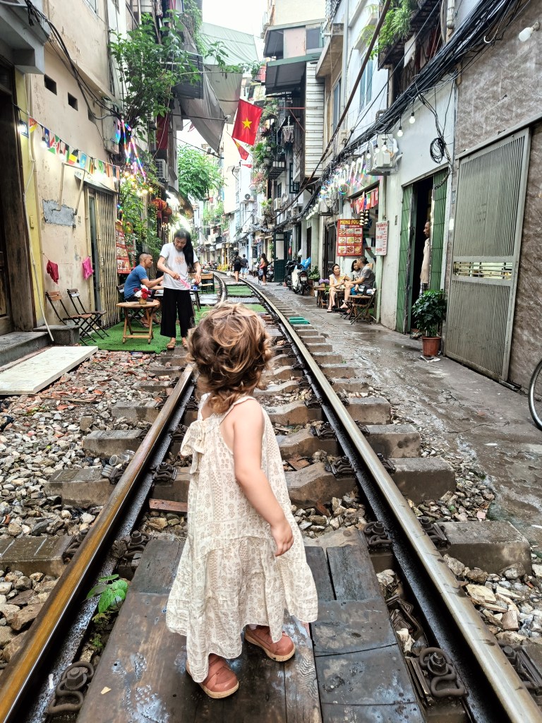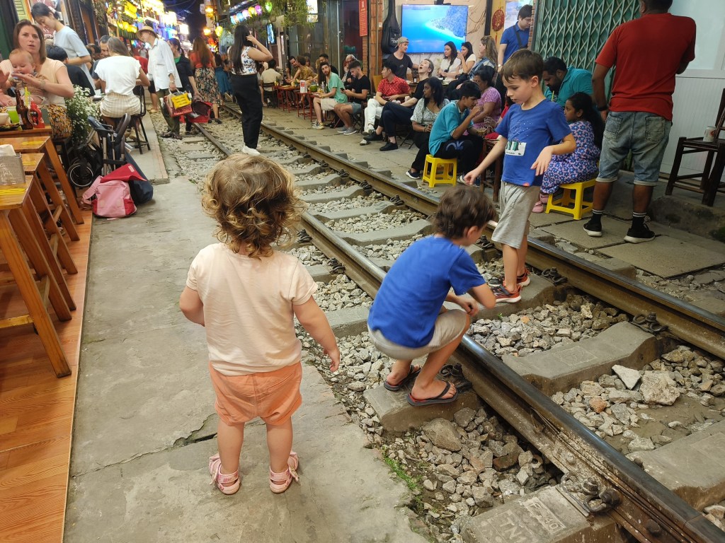Une fois les sacs chargés de fibres et de vitamines, nous allons voir une des rues les plus célèbres d’Hanoï : train street. C’est une ruelle étroite, jonchée de petits restaurants, et joliment décorée, dans laquelle passe le train qui rase les murs, plusieurs fois par jour. A l’heure où nous y sommes, il n’y a pas de passage de train prévu avant plusieurs heures. On fait quelques photos, on marche le long de la voie ferrée et on laisse les enfants (passionnés de trains) jouer sur les rails. Ils sont un peu déçus de ne pas voir le train passer, mais nous passons un bon moment.