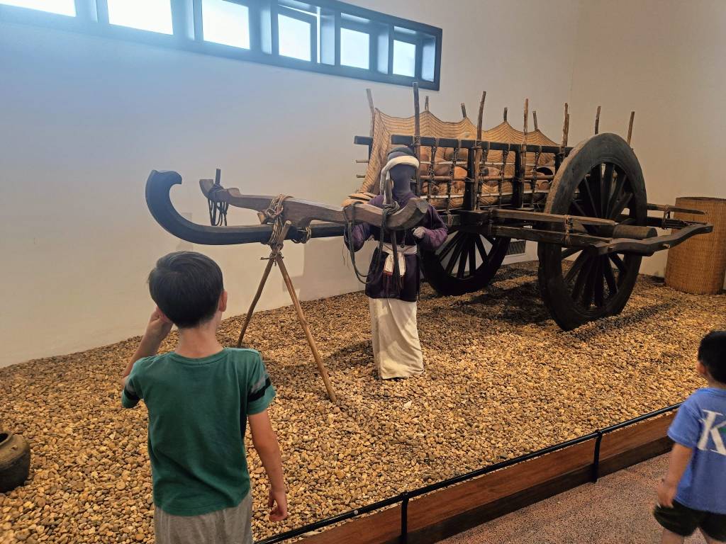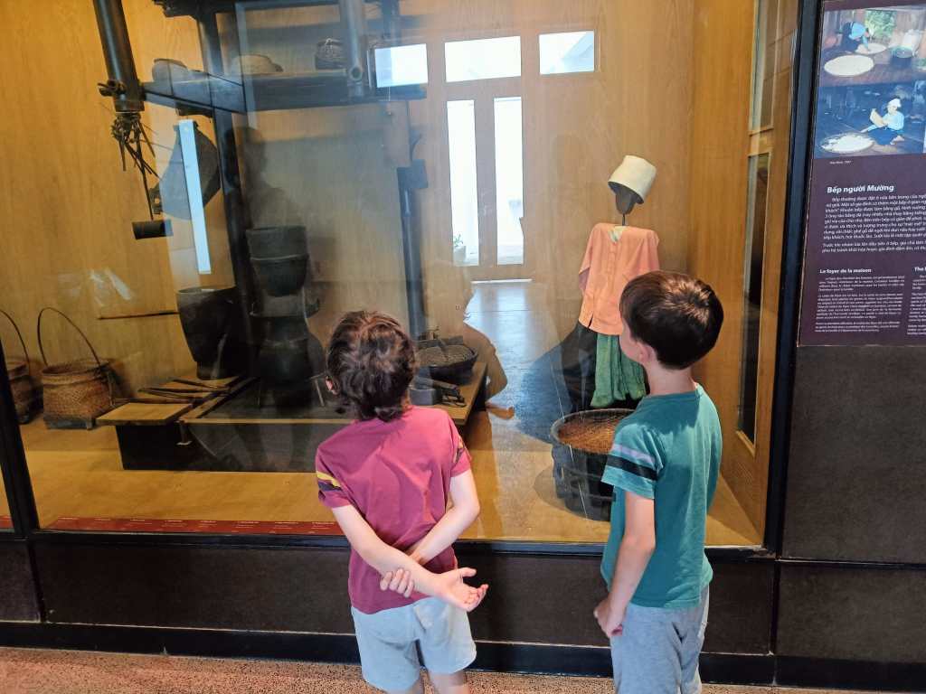 C’est notre dernière journée de visites, le lendemain sera consacré aux préparatifs du départ. Nous avons choisi de ne pas visiter les monuments à Hanoï, nous en avions vu beaucoup pendant notre séjour et nous avons privilégié la détente et les visites de proximité. Cependant, je tenais beaucoup à voir le musée ethnographique. Et nous n’avons pas été déçus, il est vraiment très intéressant. Même les enfants se sont régalés. Il explique très bien la culture vietnamienne, les différentes tribus qu’on y trouve ainsi que leur localisation géographique, leurs origines, leurs us et coutumes… A l’extérieur, il est possible de visiter les maisons traditionnelles de ces tribus. Il mérite vraiment un petit détour !