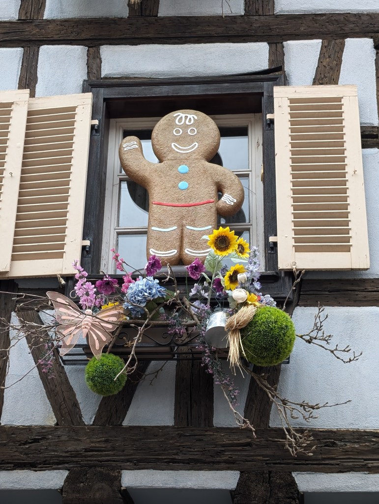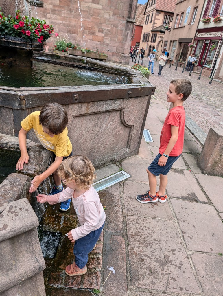 Il est joli, pittoresque et en bon état. Une belle fontaine trône au milieu du village et elle a occupé nos trois minis un bon moment. Les maisons à colombages sont partout, toutes aussi colorées les unes que les autres. Après notre petite visite, nous avons craqué sur un bretzel et avons terminé notre passage à Kaysersberg, au parc de jeux pour enfants. A peine nous avons mis un pied dans le fourgon pour reprendre la route, qu’une pluie torrentielle s’est déversée sur le village. Nous l’avons évitée de peu !