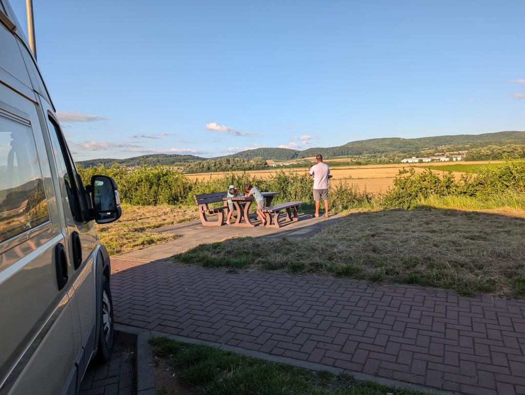 En Allemagne, les autoroutes sont gratuites, donc nous ne perdons pas de temps, nous profitons que les enfants dorment en voiture car ils sont malades et nous roulons le plus possible. Les rares arrêts sur les aires sont brefs. Même si les aires sont beaucoup plus sécuritaires qu’en France, partager les WC avec les routiers allemands, et manger en face de celui qui fait ses pompes torse-nu à même le bitume, n’est pas forcément le moment le plus agréable des vacances !