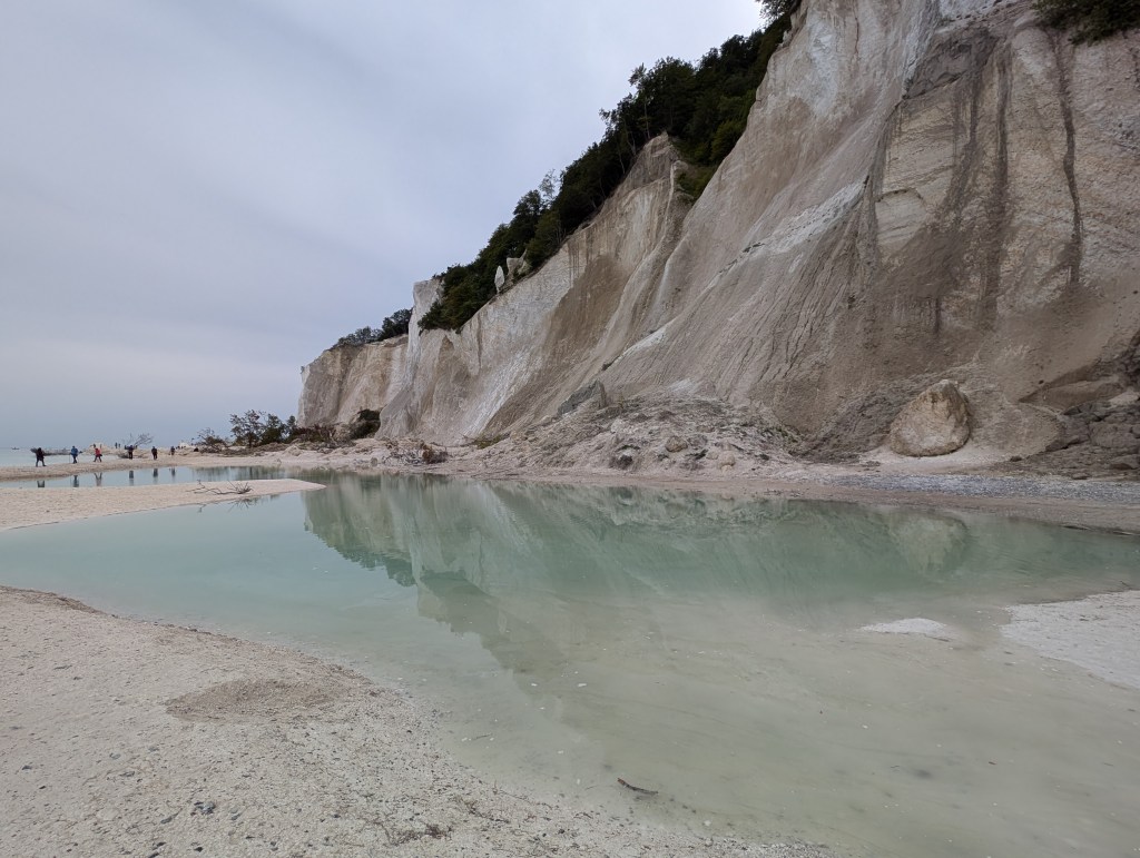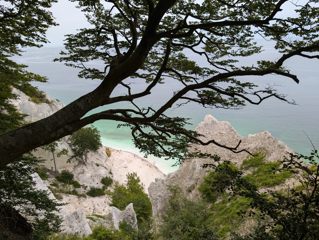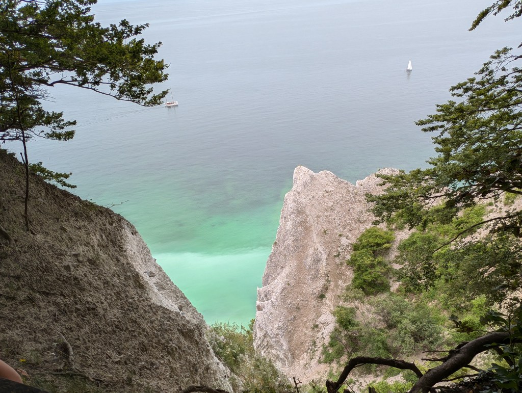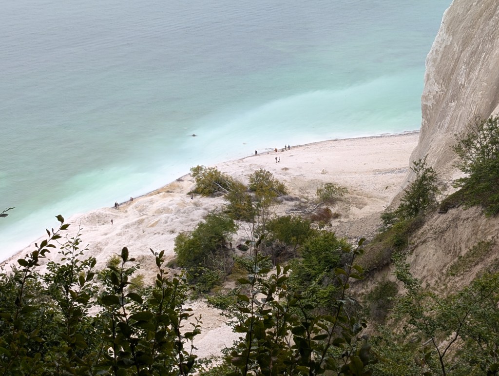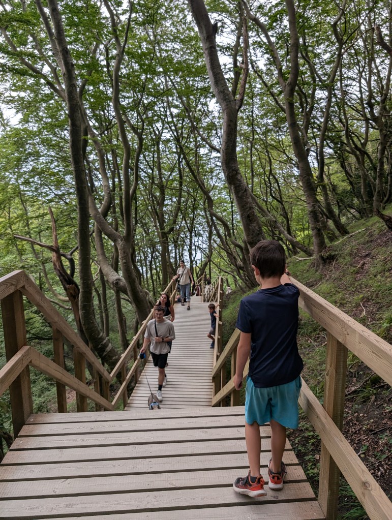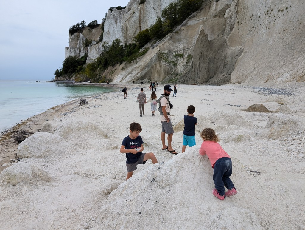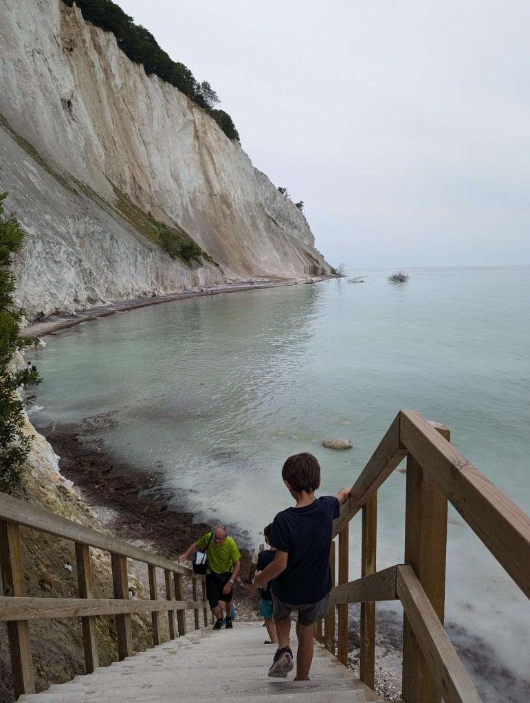 Au sud du Danemark, à seulement deux heures de Copenhague, se trouve l’un des sites naturels les plus beaux du Danemark, les falaises de Møns Klint. Il s’agit de falaises calcaires et crayeuses âgées de 70 millions d’années, qui s’écroulent progressivement dans la mer Baltique, ce qui rend l’eau de la mer turquoise et translucide. Les couleurs sont sublimes et le Danemark prend des airs de Caraïbes. Le contraste entre le turquoise de l’eau, la végétation verte flamboyante et les roches d’un blanc presque immaculé, entourées d’un ciel presque aussi blanc que les falaises, rendent ce site d’une beauté hors du commun et d’une ambiance inspirante, presque mystique. Le site propose plusieurs parcours de randonnée, certains avec des passages abrupts en haut de la falaise. Nous avions très envie de tous les tester, tant le lieu est beau, mais par sécurité pour les enfants nous avons choisi celui qui descend sur la plage par les escaliers, et qui permet d’admirer les falaises d’en bas. Les escaliers en bois sont raides et assez longs (surtout à remontrer), mais nos deux petits explorateurs de 5 et 7 ans, ont les jambes bien musclées depuis leur entrainement musclé en Asie et les centaines de marches qu’ils ont gravi pour visiter les temples sous 45°c. Ils ont trouvé l’épreuve presque « facile » avec un air ambiant de 23°c, les conditions sont beaucoup plus adaptées pour fournir un effort physique. Nous avons porté la petite exploratrice de 2 ans malgré ses protestations, car les marches n’étaient pas du tout adaptées à un mini humain de 85 cm.