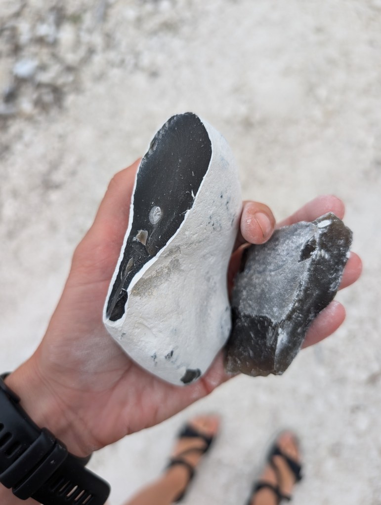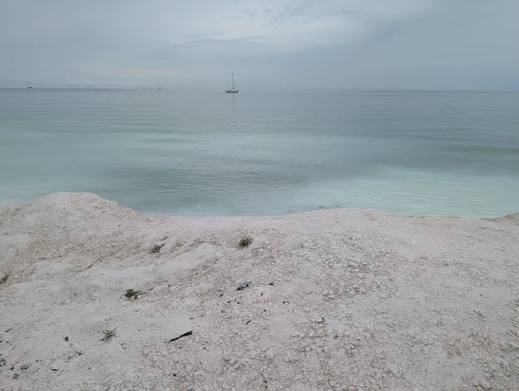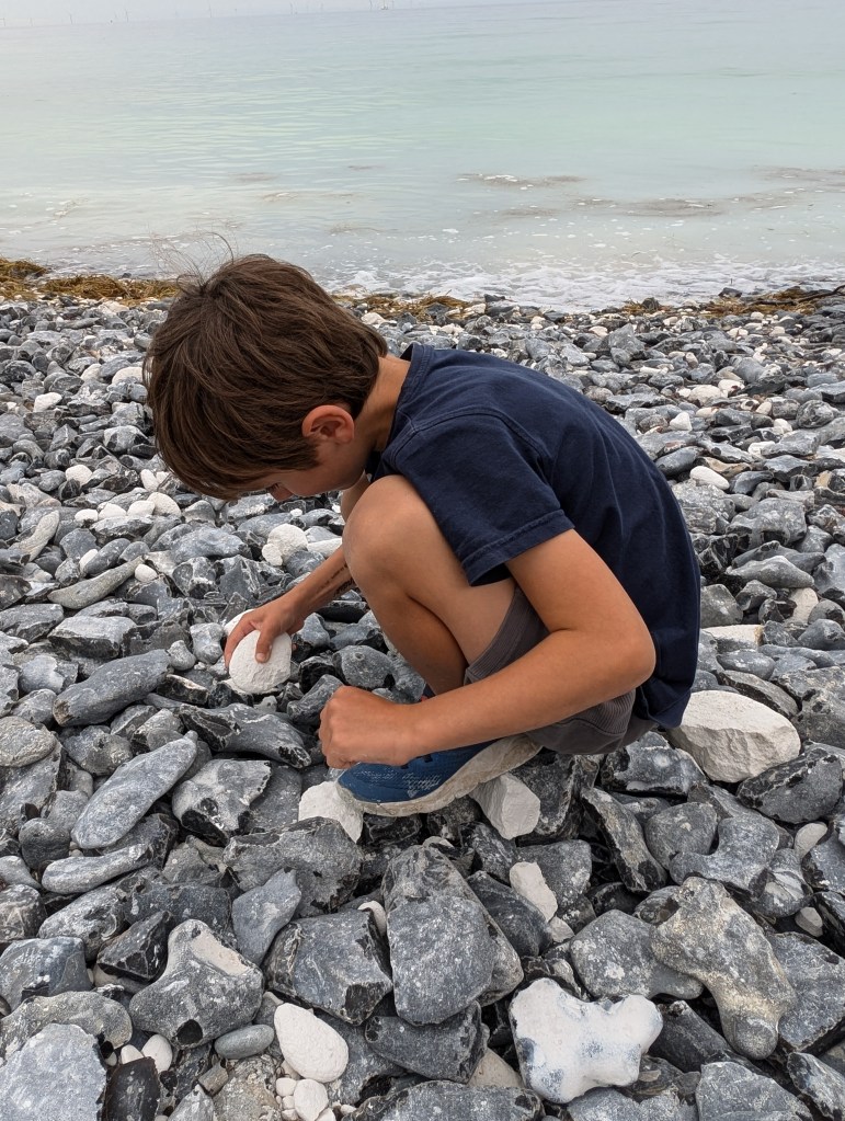 En bas, le parcours longe la plage de galets blancs de calcaire et de craies, nous avons passé un moment à grimper sur les « dunes » de galets, à écrire avec les craies échouées par milliers sur la plage, à chercher des galets avec des textures ou des formes improbables… Nous sommes revenus avec l’intégralité de nos vêtements et nos sacs tout blancs de craie, mais nous avons passé un très bon moment.