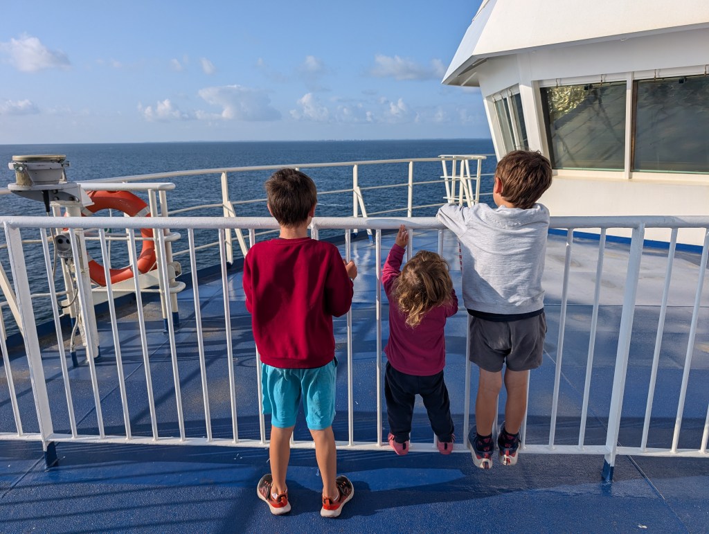 Une fois garés dans la soute du ferry, nous nous adonnons à une rapide visite des étages et des boutiques. C’est un petit ferry donc le tour ne dure pas longtemps. C’est sur le pont que nous passons l’essentiel de notre temps, à admirer la mer et surtout les cheminées du ferry pour les garçons.