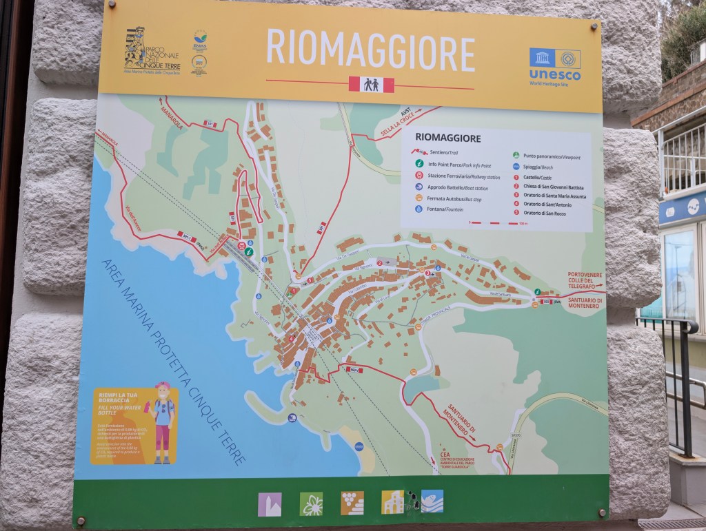 On stationne le fourgon à l’emplacement secret trouvé la veille, et nous prenons quelques précautions en mettant le bloc-volant. Nous marchons 10 minutes pour rejoindre la gare. Le trajet est dans une pente bien raide tout le long. Le retour sera plus rude ! On peut prendre les billets de train sur internet ou directement sur place aux bornes. C’est très facile et instinctif, traduit dans plusieurs langues. Il faut bien vérifier les horaires pendant la hors saison, car il n’y a qu’un train par heure. Il faut bien calculer chaque arrêt, au risque d’avoir une attente plus longue que prévue. Il y a tout de même un avantage à visiter les Cinque Terre en février : le billet de train valable en illimité toute la journée est à 36,50 € contre 84 € pour toute la famille, pendant la saison la plus haute.