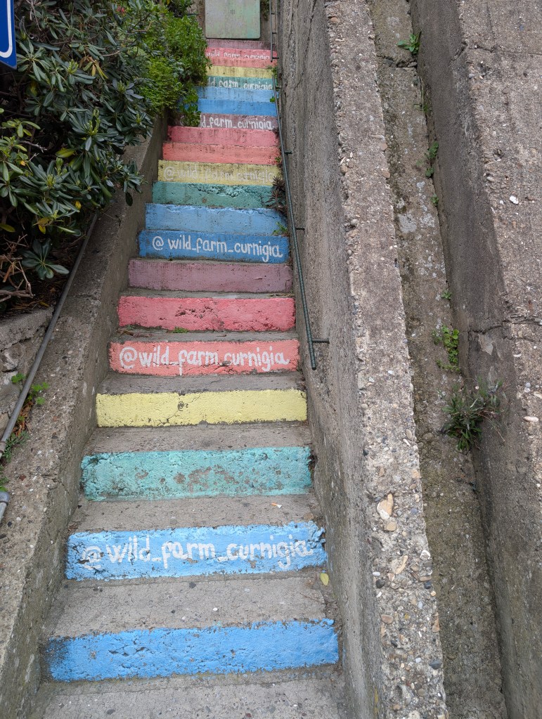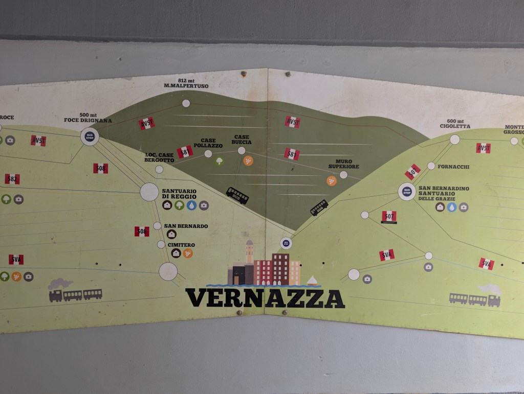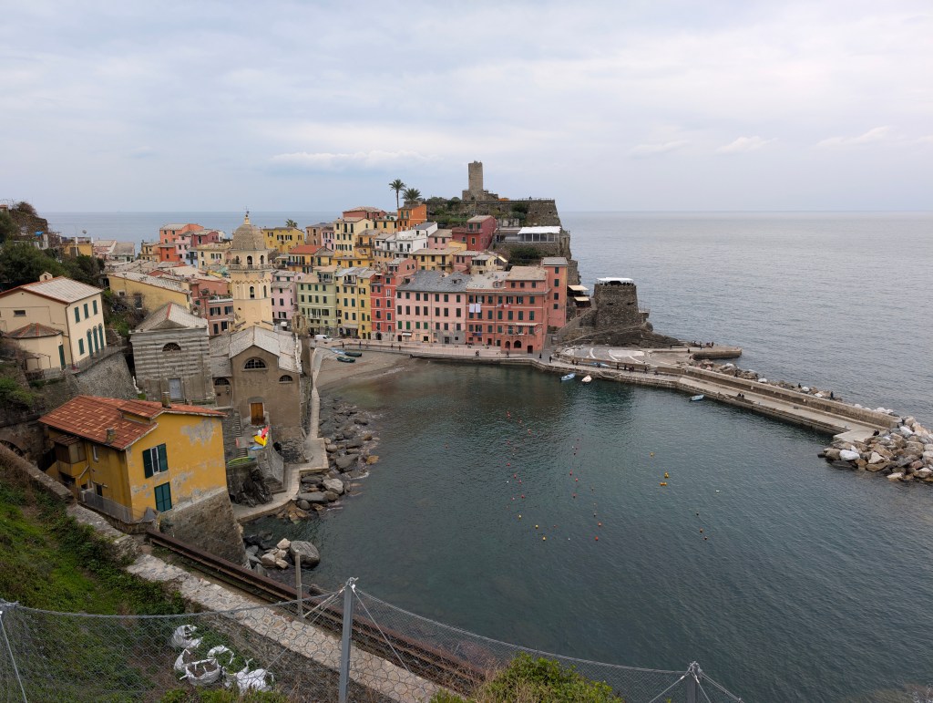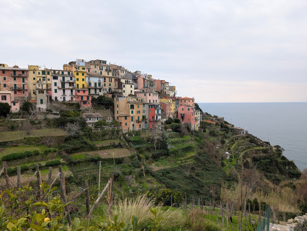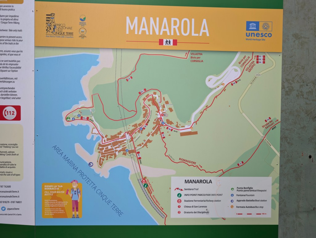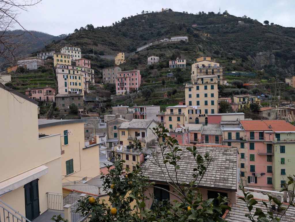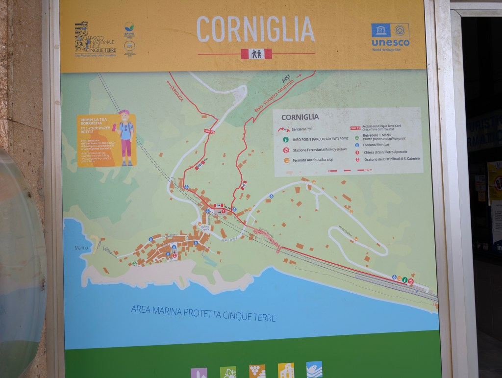 Corniglia est différent des autres villages des Cinque Terre, car c’est le seul à ne pas avoir un accès direct à la mer. Il se situe au somment d’un promontoire de 90 mètres. Les maisons sont également plus basses et plus étroites que dans les autres villages. Depuis la gare, l’accès au village nécessite de prendre une navette mise à disposition gratuitement par la ville ou d’emprunter le long escalier de briques « Lardarina » et ses 377 marches. Nous avons choisi l’option sportive. La plupart des magasins et restaurants étaient fermés dans ce village, à cette période.
