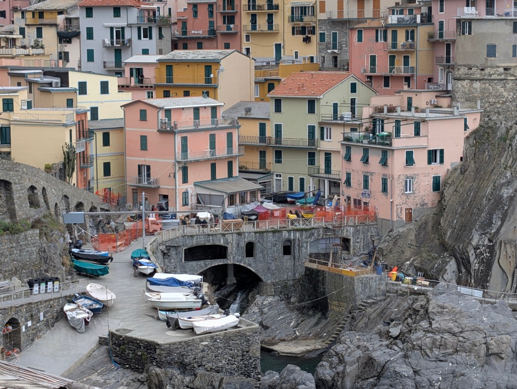 Nous commençons par la plus éloignée de Levanto : Riomaggiore. C’est le village le plus au sud des Cinque Terre, le seul classé au patrimoine mondial de l’UNESCO. Ses maisons colorées semblent empilées les unes sur les autres. Le terrain est particulièrement en pente dans ce village. De quoi muscler les petits mollets ! Riomaggiore est divisé en deux zones : la partie supérieure est consacrée à l’activité agricole en restanques. C’est plutôt escarpé et nous avons choisi de ne pas aller la visiter. La partie la plus basse est plus accessible, on y trouve le petit port de pêche, les pointus colorés, les filets de pêches, les magasins, les restaurants, bars et une plage de galets.