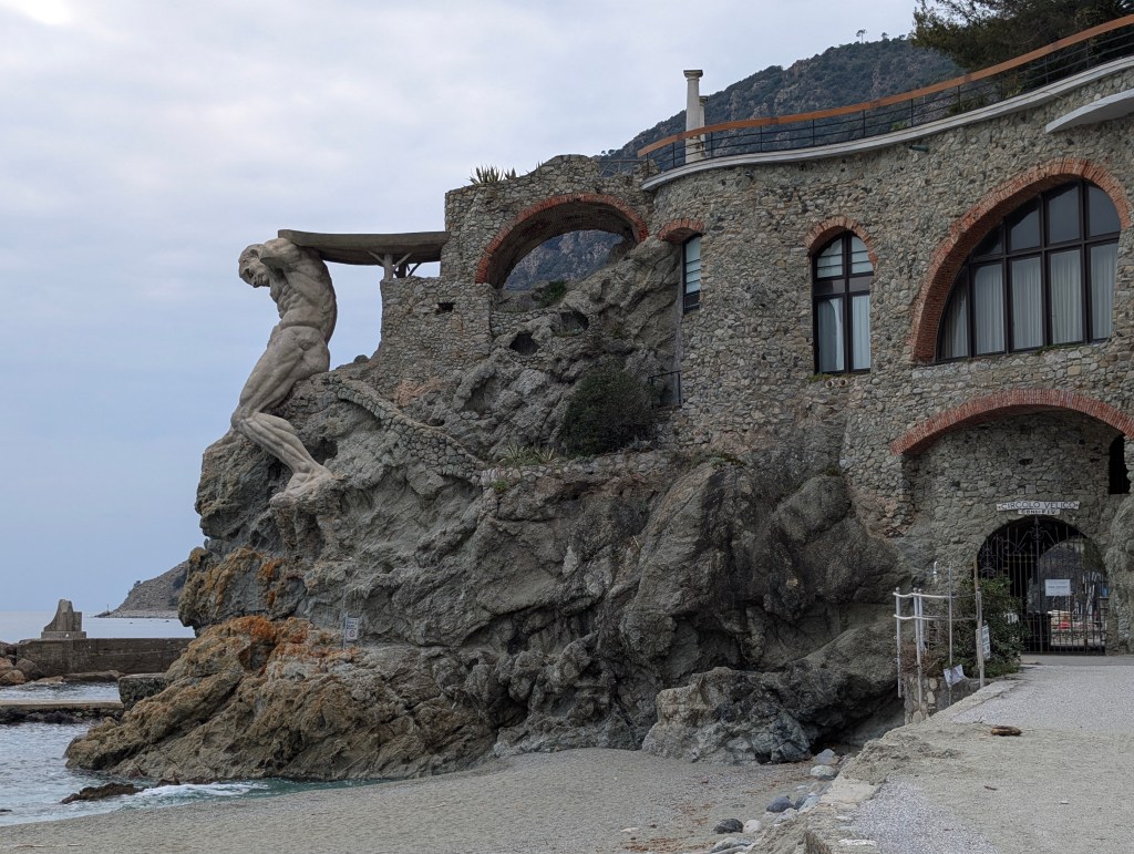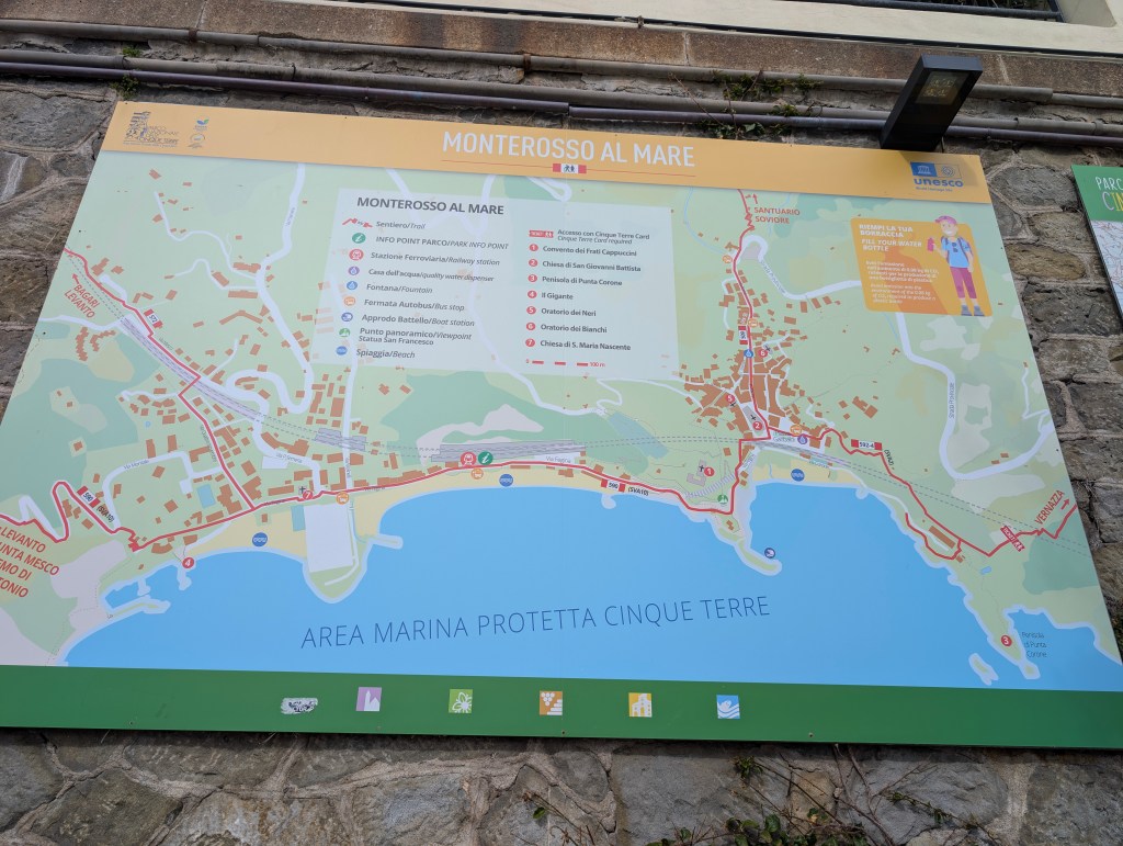 Le dernier village, le plus au nord, est Monterosso al mare. C’est le plus grand avec 1400 habitants à l’année. Le village est séparé en deux par un château médiéval en ruines sur la colline de San Cristoforo. Du côté de la gare, se trouve la partie moderne et balnéaire de Monterosso, avec une longue plage. Il faut passer dans un tunnel pour visiter l’autre côté, un vieux bourg typique avec les maisons colorées et les ruelles enchevêtrées, qui fait le charme et l’authenticité du village. On peut observer la statue de Neptune en béton armé accroché à la falaise qui surplombe la plage de Fegina. Elle mesure 14 mètres de haut et pèse 170 tonnes. Elle a été créée en 1910 mais a été endommagée pendant la seconde guerre mondiale.