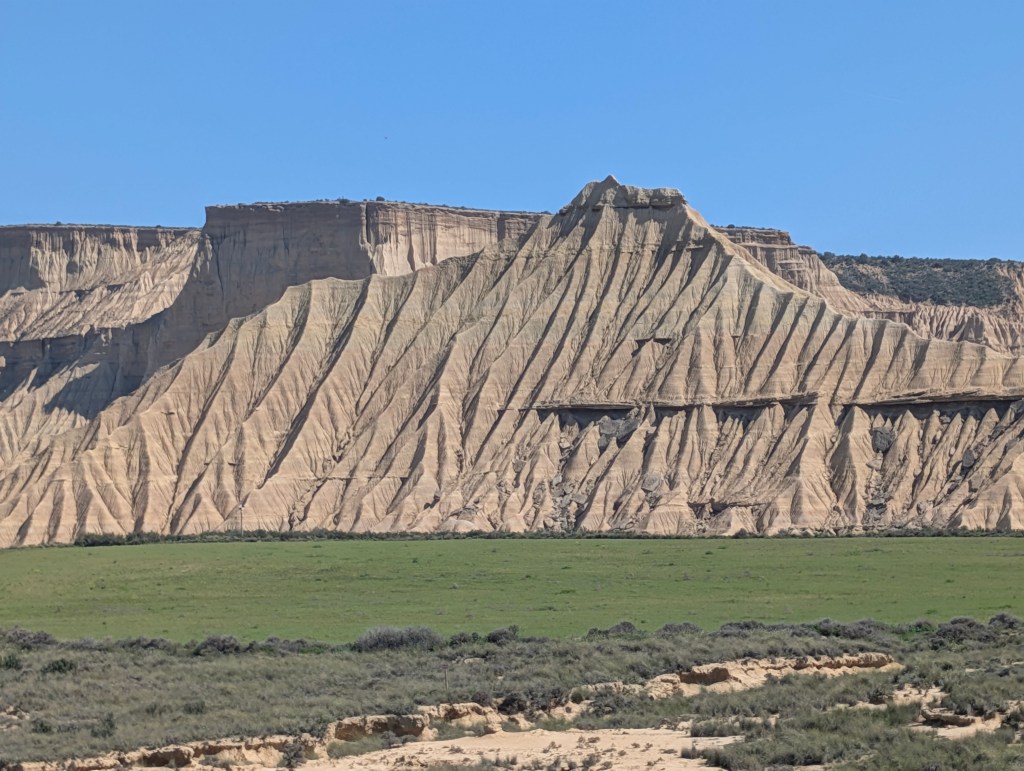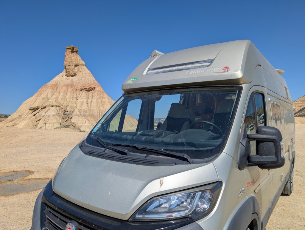En Navarre, à peine à 70 km des Pyrénées, se trouve une réserve naturelle semi-désertique, le désert de Bardenas Reales. Nous avions hâte de découvrir ces paysages lunaires dignes d’un western. Des airs de mini Grand Canyon mais en Espagne ! Il s’agit d’un site protégé donc il n’est pas autorisé d’y passer la nuit. Ce sera donc une visite uniquement sur la journée. Il faut respecter une règle essentielle lorsqu’on visite les Bardenas Reales, il ne faut pas grimper ni marcher hors des sentiers ou sur les flancs des formations géologiques. Il s’agit d’un écosystème très fragile, et il appartient à tous de le préserver.