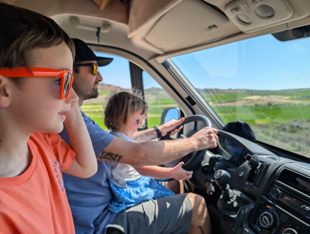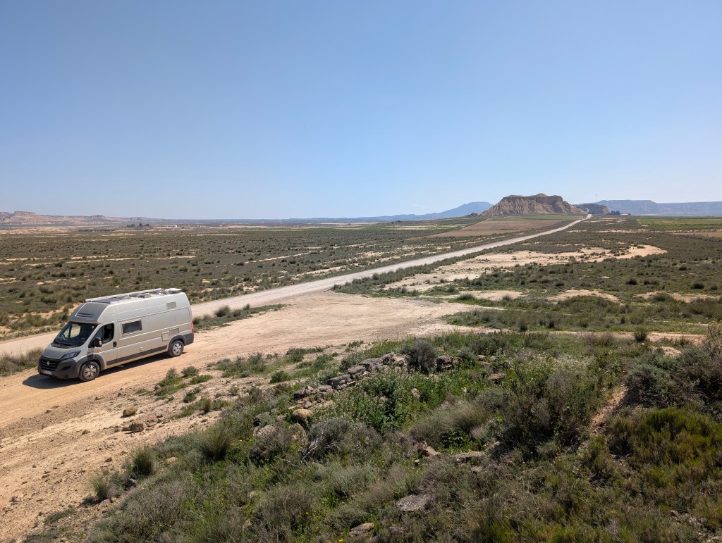 Nous reprenons la route jusqu’à notre prochaine destination à plus de deux heures de trajet… Nous avions hâte de nous poser dans ce lieu en pleine nature dans les hamacs avec un bon livre et une boisson fraîche mais… le fourgon est rempli de poussière très fine ! Il y en a absolument partout, une couche épaisse à l’intérieur comme à l’extérieur, dans les lits, les placards de nourriture, les sacs de vêtements… On ne sait pas comment elle a pu s’infiltrer à ce point dans les moindres recoins du véhicule ! Elle se mérite la visite du désert des Bardenas Reales ! Nous passons donc un long moment à sortir toutes nos affaires, et tout secouer à l’air libre. C’est aussi ça la vanlife !